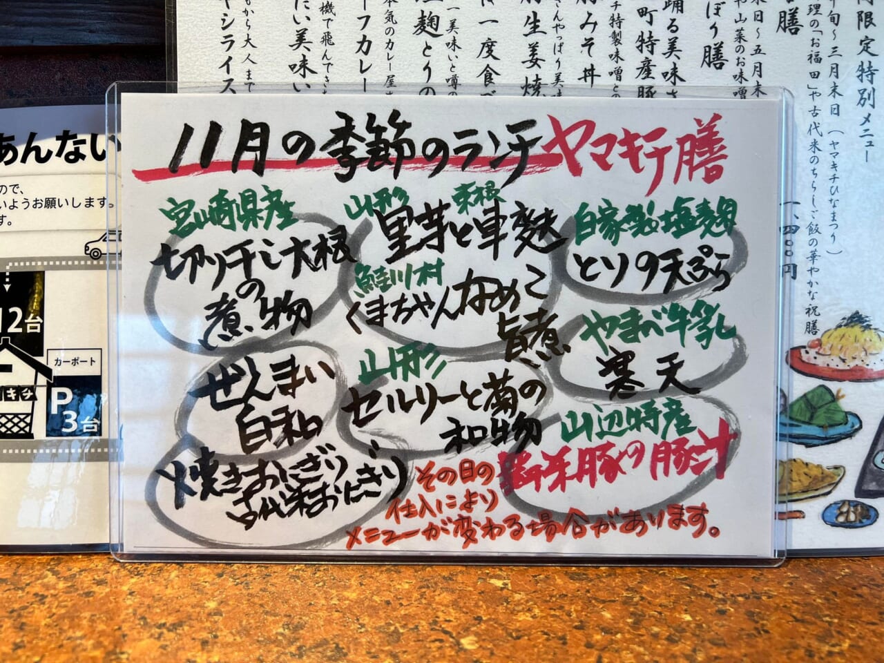 11月の季節のランチです。 ランチメニュー(税込) 1,100円 コーヒーセット(税込) +コーヒー 1,300円 デザートセット(税込) +ケーキ、コーヒー 1,650円 内容 宮崎県産切り干し大根の煮物 里芋と東根車麩、鮭川村くまちゃんなめこの旨煮 自家製塩麹とりの天ぷら ぜんまいの白和 山形セルリーと山形菊の和物 焼きおにぎり 古代米おにぎり 山辺特産舞米豚の豚汁 やまべ牛乳寒天 その日の仕入れによりメニューが変わる場合があります。 ご紹介